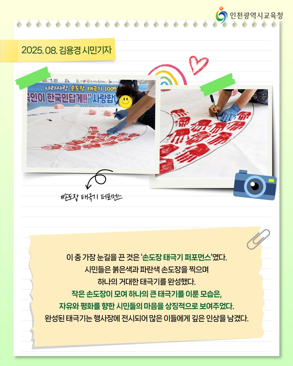 작은 손도장이 모여 하나의 큰 태극기를 이룬 모습은, 자유와 평화를 향한 시민들의 마음을 상징적으로 보여주었다.