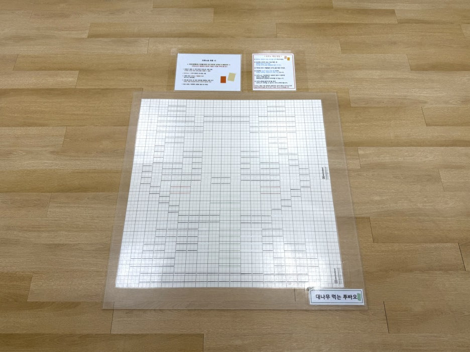 바닥에 놓여진 도안을 따라 색깔을 맞춰 도미노를 놓으며