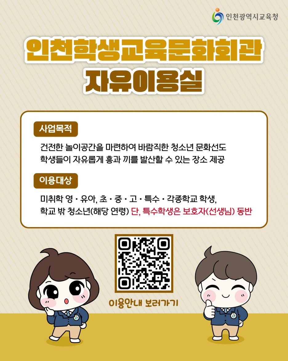 인천학생교육문화회관에서 자유롭게 이용할 수 있는 공간은 어떤 곳이 있는지,